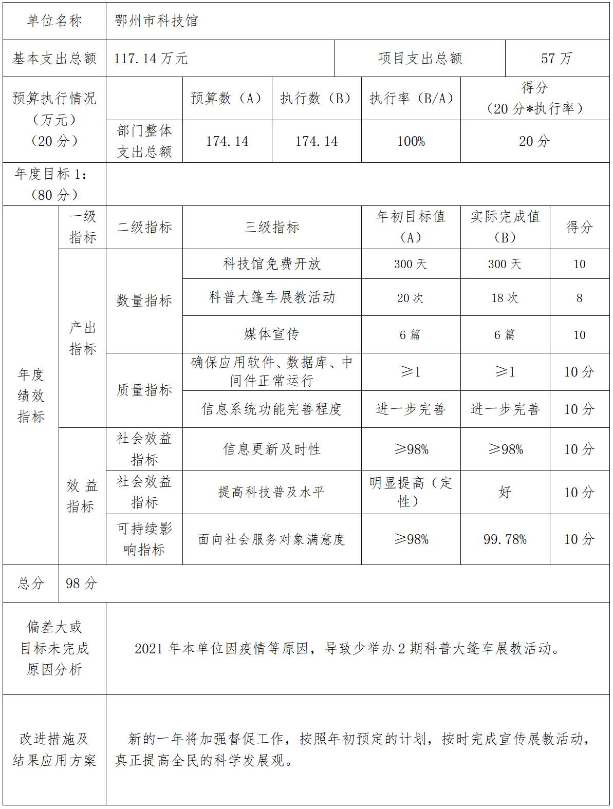 2021年度鄂州市科技館整體績效自評結果
