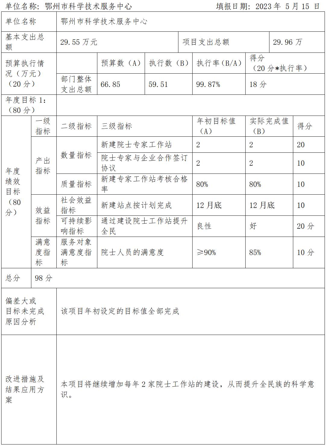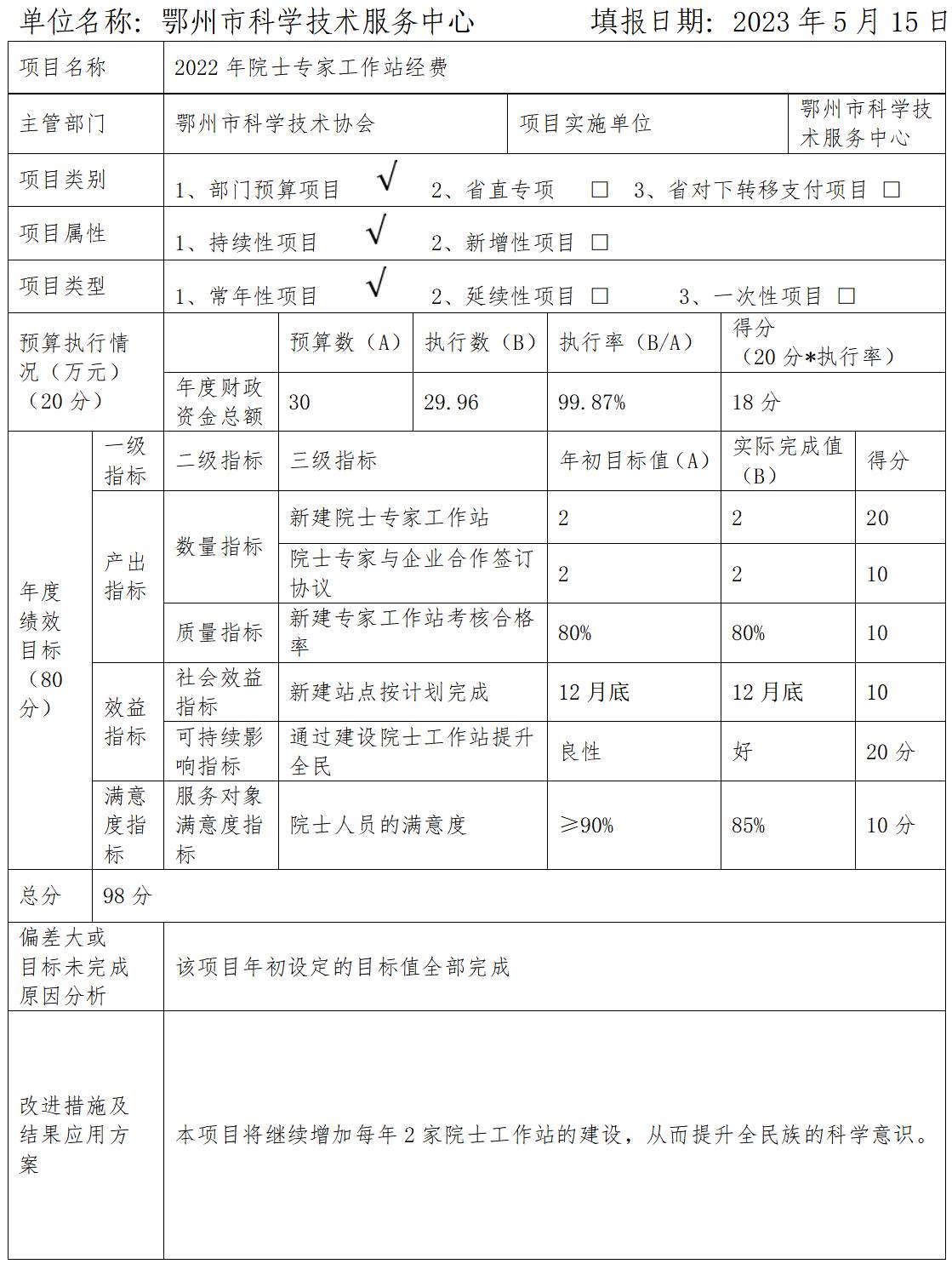 院士專家工作站經(jīng)費(fèi)項(xiàng)目績(jī)效自評(píng)綜述:項(xiàng)目全年預(yù)算數(shù)為30萬(wàn)元,執(zhí)行數(shù)為29.96萬(wàn)元,完成預(yù)算99.87%。主要產(chǎn)出和效益:一是數(shù)量指標(biāo)中的新建院士專家工作站、院士專家與企業(yè)合作簽訂協(xié)議;二是質(zhì)量指標(biāo)中新建專家工作站考核合格率;三是效益指標(biāo)中新建站點(diǎn)按計(jì)劃完成、通過建設(shè)院士工作站提升全民、院士人員的滿意度。發(fā)現(xiàn)的問題及原因:該項(xiàng)目年初設(shè)定的目標(biāo)值全部完成。下一步改進(jìn)措施:一是對(duì)個(gè)別項(xiàng)目經(jīng)費(fèi)的績(jī)效考核指標(biāo)重新進(jìn)行梳理,使指標(biāo)設(shè)置更合理、更能反映項(xiàng)目的實(shí)際使用情況;二是適當(dāng)調(diào)整定性指標(biāo)的比例,增加數(shù)量、質(zhì)量等可直觀衡量的指標(biāo);三是提高考核結(jié)果在指導(dǎo)財(cái)務(wù)工作中的應(yīng)用。