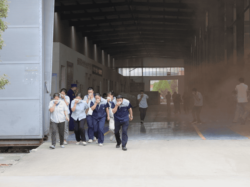 模擬火災(zāi)演練環(huán)節(jié)以企業(yè)日常場(chǎng)景為背景,演練啟動(dòng)后某車間出現(xiàn)煙霧,企業(yè)應(yīng)急機(jī)制快速響應(yīng)。疏散引導(dǎo)員迅速到位,指引員工用濕紙巾捂口鼻、彎腰低姿,沿安全出口標(biāo)識(shí)有序撤離。員工相互配合,最終全員安全抵達(dá)集合點(diǎn),檢驗(yàn)了應(yīng)急避險(xiǎn)意識(shí)與疏散機(jī)制的有效性。