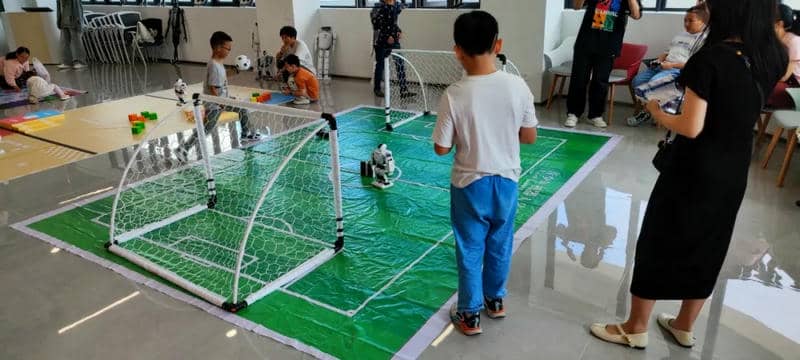 機器人競賽區(qū)搖身變成“迷你戰(zhàn)場”,成了孩子們釋放熱情的天地!只見小“指揮官”們緊握著控制器,眼神專注又認真:有的指揮機器人瞄準球門射門,有的操控“機甲”搬運物資,還有的和小伙伴配合完成協作任務,忙得不亦樂乎。